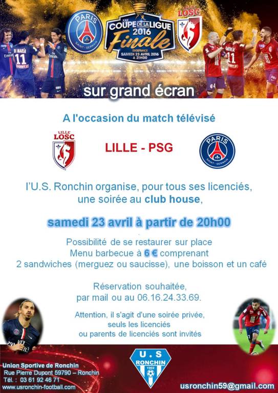 A l'occasion du match télévisé LILLE - PSG, l’U.S. Ronchin organise, pour tous ses licenciés, une soirée au club house, samedi 23 avril à partir de 20h00.