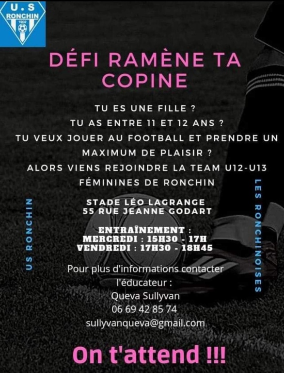 đ Si vous avez entre 11 et 12 ans, nous vous attendons nombreuses aux entrainements pour dĂ©couvrir le football et pourquoi pas intĂ©grer notre club.đȘđ”âȘ